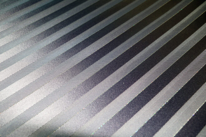 綾織の変化組織「杉綾」に繻子織を乗せた柄です。見た目にも変化がありますし、触った感じも一つの組織で織り上げるより凹凸感が出て、生地に立体感を出す事が出来るようになります。複雑な組織変化を付ければ付けるほど職人の織技術が必要になります。