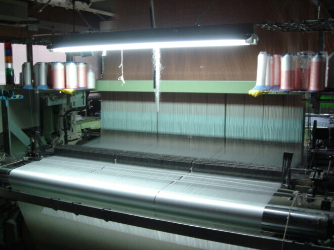 織物の基本は経糸(たていと)を平行に張り(上画像参照)、その間に緯糸(よこいと)を通して様々な文様を織る技法です。経糸が上下に動き、その隙間に緯糸が通るイメージです。経糸が上下する順序によって異なる組織が表現されていきます。織物の基本的な組織は平織・綾織・繻子織とあり、織物の三原組織と呼ばれます。