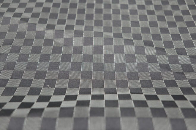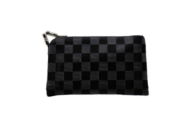 ナイロンは透明なので画像で見るとぼんやりとしか市松に見えないと思いますが、光が当たるとキラッと柄が浮かび上がって本当にカッコ良い生地なのです。ナイロンでキラキラしていると言うと派手なのかと思いますが、ぱっと見は普通にブラックの無地に見えるので意外にもどんな方でも持てる眼鏡ケースになっています。