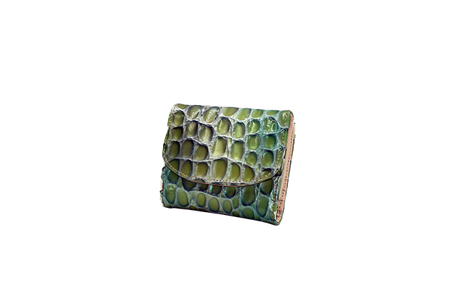*参考までに・・・この様な革見た事無いでしょうか?表面を樹脂で固めた革で美しい見た目が特長なのですが、革の風合いを残しているかと言うと?しかないと個人的には思っています。合皮と言われても区別が付かないと思います。しかも表面が樹脂なので必ず劣化します(画像の財布も実は劣化していて剝がれているんですが判りますか?)