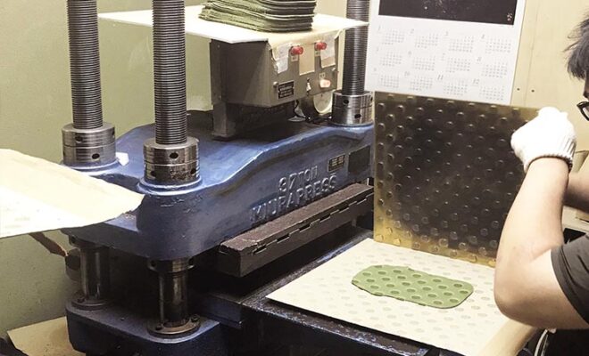 こんな機械でひとつづつプレスしていきます。何トンという力で一瞬で表面に凹凸を入れる事が出来ます。手を挟んだら大変!