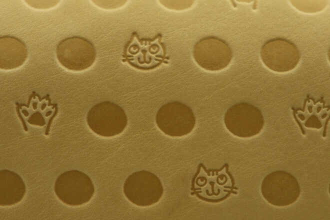 牛革に型押しでしっかりと可愛い「ねこと肉球」がプレスされており牛革の表面が立体的な凹凸になっていて、ちょっとコミカルな絵柄ですがそれがまた良い味出していると思い一目惚れしてしまいました。