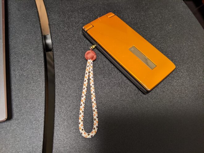 丁度オレンジのガラケーなのでブラウンの組紐ストラップを合わせてみました。ストラップの丸い部分が可愛くてなかなかお洒落だと思います。丸い部分は小田巻と呼ばれるものです。