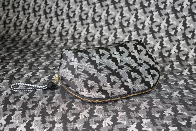 西陣織シルク・軽量ファスナーポーチ・コスメポーチ・バッグインバッグ・伝統工芸・京組紐引手・グレンチェック・迷彩柄・ブラック・レディース・日本製