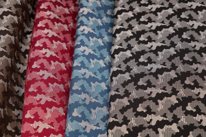 西陣織の技術の高さが感じられる千鳥格子に、モダンな迷彩柄が組み合わさり唯一無二の生地に