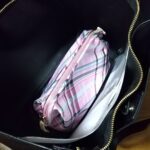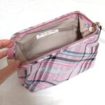 こちらのポーチの特徴は、なんといっても西陣織のシルク生地!画像ではわかりづらいですが、光の当たり方で色が微妙に変化するんです。チェック柄も可愛いし、見ていて飽きない。明るい色なので、黒いバッグの中でも存在感があります。