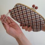 西陣織シルク × 京組紐のお財布/西陣織シルク・がま口長財布・京組紐ストラップ付・ギンガムチェック・ブラウン